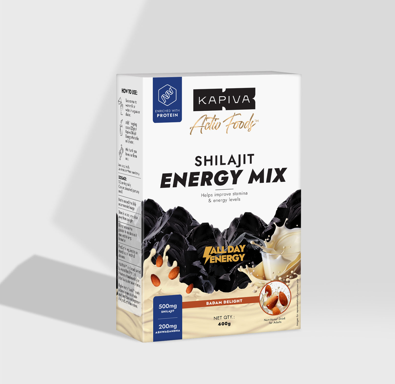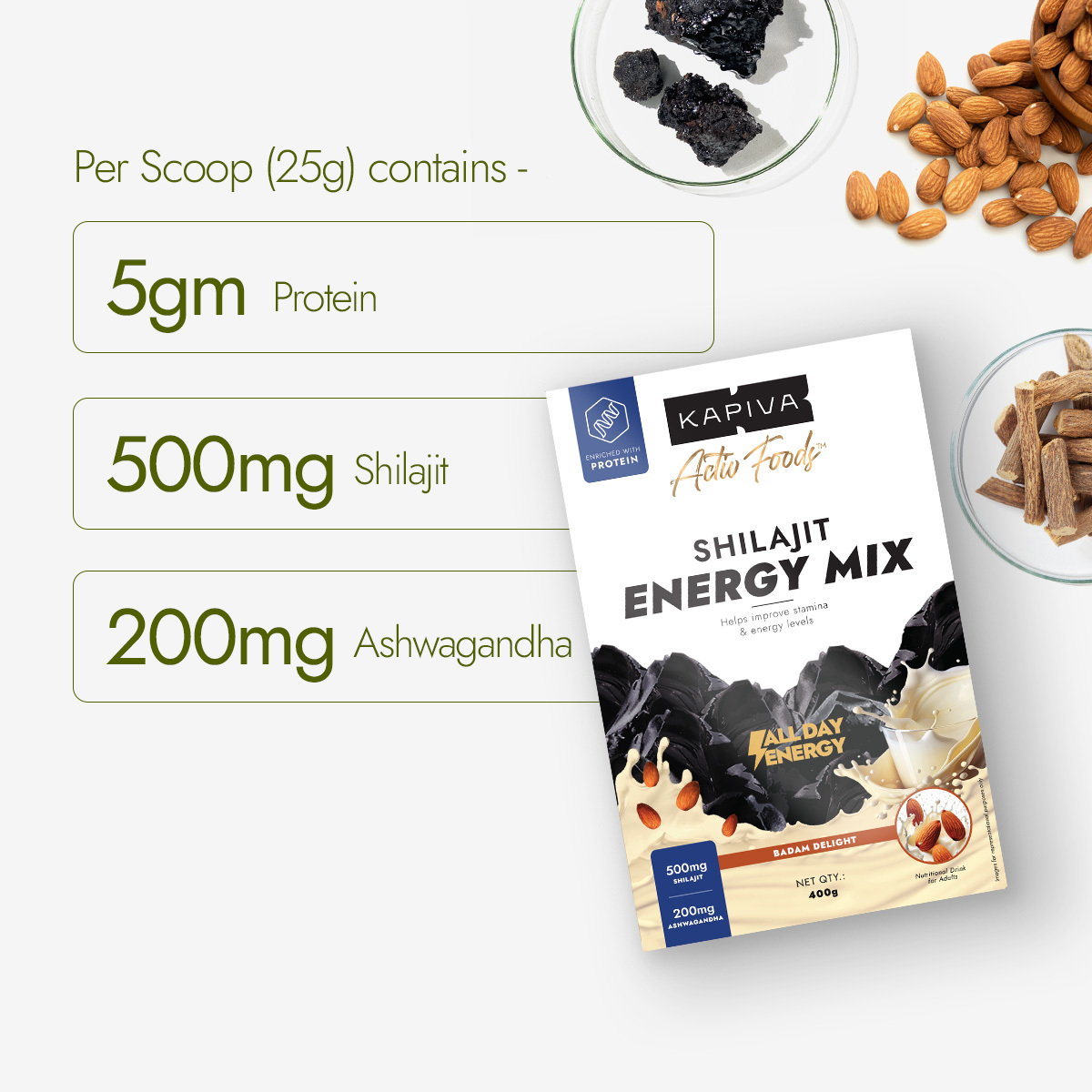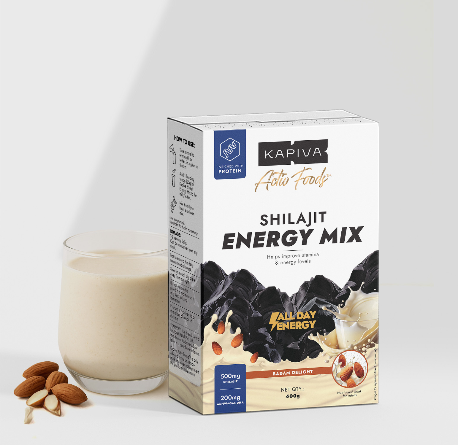 Kapiva Shilajit Energy Mix in Badam flavour is your daily dose of all-day energy. It is blended with Ashwagandha and protein-rich milk powder, and topped with almond slices, this mix improves energy and stamina, reduces stress, and promotes restful sleep—with every sip.